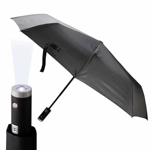 The Black Flashlight Umbrella by Torch-Brella is a classic black coloured umbrella, that is crafted from lightweight fabric. With eight ribs and a quick-release button function, this umbrella will always keep you protected from the rain or sun. Featuring a torch on the base of the umbrella, you can also be ensured that if it is dark or in a case of emergency, you can activate the torch to help guide you.